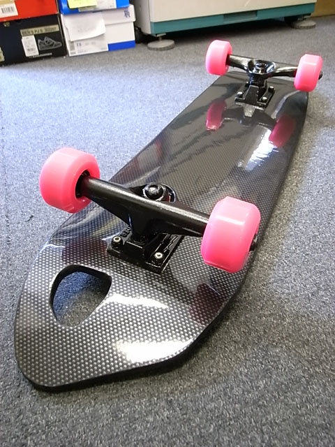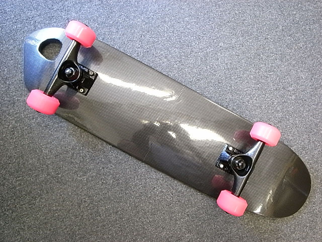 で、そんなシェイプのデッキの最先端がこちらの池之上慶太のクルーズデッキ。さっそく拝見してみましょう。まずね、超ウケるのが慶太自身が「お米クルーズ」って言ってるこのシェイプ。たぶんお米にするつもりはなかったんだよ。ただちょっと人と違うけどしっかり乗れてグリップ穴があるシェイプをフリースタイルでカットしたらこうなった。細かい経緯はこちらでチェックしてもらうとして、個人的にはこのシェイプはかなり利にかなっていると思いました。まずデッキのリシェイプですが、ホイールベースをやや短めに作り直していること。そしていろいろなトリックが出来るようにノーズ、ホイールベース、テールのバランスを考えていること。でも最終的にはFTPパットを装着しちゃうこと。ま、すべてにおいて実に「慶太らしい」セッティングとなっております。でもこの全面ステッカー貼りはカッコいいよね。マジで腐りがけのデッキもかなり生き返ります。このファイバーシート調の模様がさらに素敵。ぜんぜん強度とか関係ないですけど。サイズは慶太が乗り終わったデッキのリシェイプですから幅7.5インチ、長さはちょっと削って30インチ位かな。もうちょっとテール切ってもよかったね。