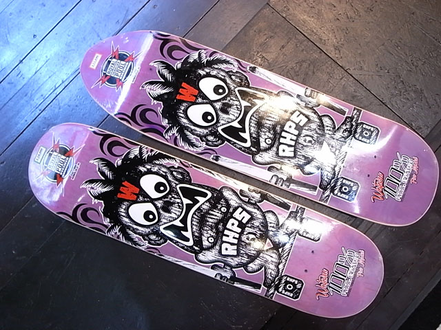その亘が持って来てくれたのがこちらのROYAL HAWAIIAN POOL SERVICEからリリースされている亘のシグニチャーモデルであります。今回は8インチとPOOLシェイプの2種類ね。最近の傾向だとちょっと普通と違うシェイプだと全部「クルーズデッキ」って言われちゃう風潮がありますが、こちらはPOOL SHAPEですからね。漢のゴリ攻めシェイプです。そしてREALのTGはORIGINAL SHAPE。REAL最初のデッキで当時の最先端の鬼攻めシェイプであります。当時のデッキよりコンケーブはきついですが、RHPSもREALもどちらもクルーズデッキじゃないの。デッキのシェイプって実にさまざまで、ちょっと前にINSTANT BLOGでご紹介した小林幹夫のTENGU SKATEBOARDとか、SHAMAくんのPORTABLE CRUISEとか、JANダイちゃんのテクニクルーズとか、もうやっぱりいろいろな思いが込められている訳ですよ。ライディングに関わるこだわりもあればスタイルのこだわりもあって、一本のスケートボードからは実に様々な人生模様が伺いしれるのであります。なんてね。