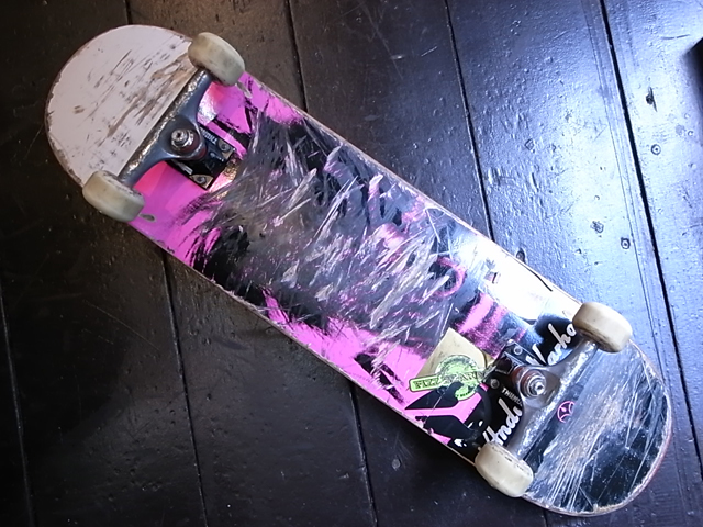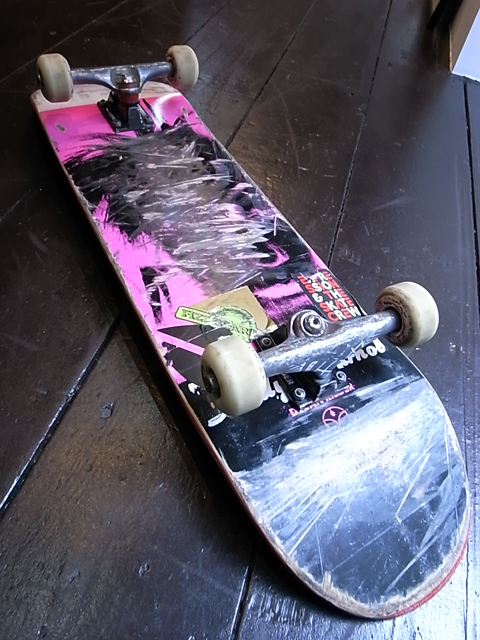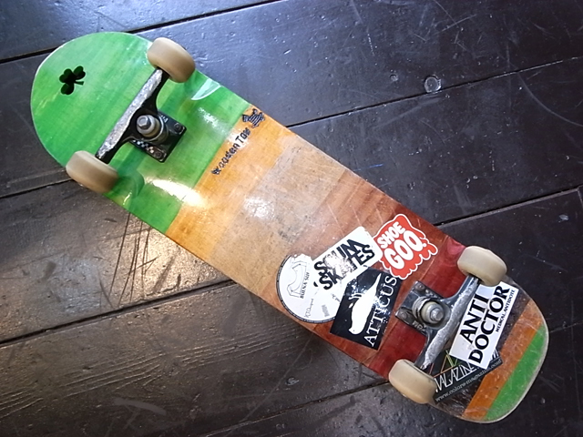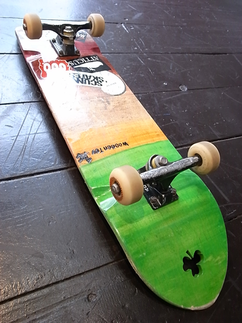 そしてある日の吉祥寺ストア開店と同時にやってきた女子二人組み。仙台からの刺客と、って別に襲いに来た訳じゃなく楽しそうにやってきたサトミックス。チヒロックのエントリーでいつも拝見しておりますし、いろんなイベントでもお見かけしておりましたがちゃんと話したの初めてだ。とても素敵な女性でした。Rにあんな突っ込みできる女子は激しいタイプかと思いきや実物は穏やかでニコヤカであります。さすがだ。で、いつも気になっていたデッキを拝見させてもらいましたよ。サトミックスはR上手いよね。駒沢がローカルなのかね?住んでるとこは代田橋って言ってたから駒沢も世田谷も渋谷も祖師谷も全部射程距離。スケート環境かなり良し。山の手は武蔵野や八王子やタマリもあってかなりスケートボードが社会に浸透・・・、いやまだまだです。もっとさらにスケートボードが普通の生活に溶け込んで行くようがんばっちゃうもんね。ま、それはいいとして、サトミックスのデッキはwooden toyでありますよ。初めて会ってからずっと大場くんシェイプのデッキに乗ってる。サイズはどれくらいだろうか。メジャーがなくて個人的な目測ではありますが、ずばり7.75インチ。ウィールバイトしない仕様とノーズのクローバーがとてもうらやましい。いろんなショップに並んでいるデッキではないので、気になる方は本人に聞いてみて。僕もかなり欲しい。