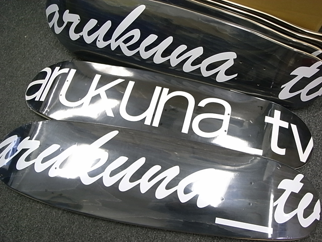 吉祥寺ストアにチャリで来たのでまだちょっと暑いのよ。チャリ通は日々発見があって面白い。今日は近道見つけて驚きのタイムが出ました。ドアtoドアで考えると電車やバスの半分の時間で到着します。でも雨が心配ね。夜まで降らないでちょうだいよ。もうちょっと家とショップが近かったら間違いなくクルーズデッキで通っていることでしょう。そう。このarukuna_TVのクルーズデッキでね。最近のクルーズデッキはもう日常生活にかなりググッと浸透していて、吉祥寺ストアいると毎日その辺でクイクイしてます。音も静かで乗りやすく、トリックの練習をしたい訳ではない人にはまさにうってつけ。初めての一本としても乗り方の基本が身についていいかもね。このarukunaクルーズはサイズもシェイプもかなり日常生活向きですので、一家に一台。玄関には柔らかめのウィールを装着したこのデッキがスタンバッていると楽しい毎日であります。限定生産ですので、無くなる前にお早めに!