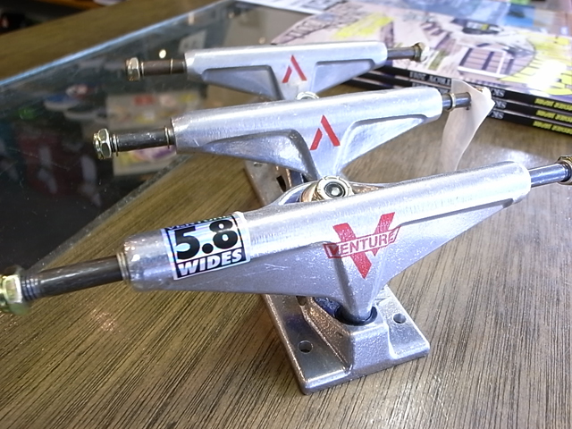 そしてね、VENTUREがDLX傘下に入ったのは業界の人はみんな知ってることですが、DLXから出荷された新しいVENTUREにはこの5.8って幅広サイズが追加されております。これすごいね。なんかVENTUREっぽいというかDLXっぽい。デッキのサイズにして8.5インチくらいがベストなのかな。最近は8.25インチくらいはパークとかでよく見るサイズになってきてますから。そう考えるとトラックメーカーとしてはこのサイズが無いのもちょっとNGな感じですね。さすが。デッキサイズ大き目の方はぜひお試しあれ。