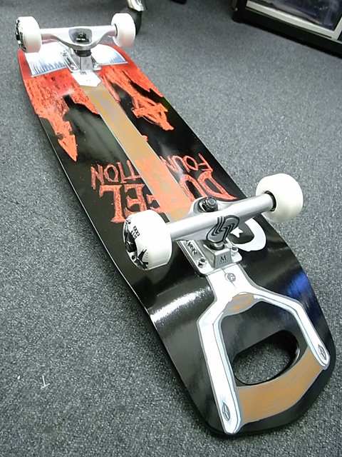 デッキはね、FOUNDATIONのクルーズデッキ?いや、これはクルーズ目的というか確信犯。スコップだもんね。取っ手の穴付き。相当強烈な個性派デッキであります。でもね、かなり乗りやすいサイズだと思うよ。なんでそんなにこのデッキにググッと来たのかといいますと、ウィールがね54mmなんですね。BONESのソフトウィールなんですが、このサイズを合わせようとするのはまた確信犯。普通の流れで行くとガッツリ大き目で行きますよね。そこをこのサイズを合わせるのはもうかなり「わかってらっしゃる感」がにじみ出ちゃうのです。見た目は普通の硬いウィール、トラックもSILVERの800でデッキに合わせたサイジング。さすがだ。これみたらかなりイケイケの人かと思うけど乗ってみたらソフトウィールでハッとなりそう。僕は組み立てながらニヤッとしてしまいました。なんか余裕ある感じが素敵です。