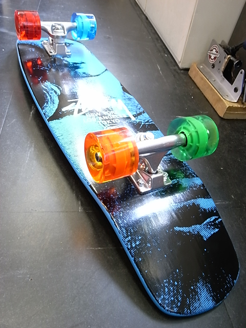 クルーズといえば、先日浦安ストアで通販頂いたこちらのコンプリート。かなりグッと来たのでご紹介したいと思います。クルーズデッキって基本的には柔らかいウィールが着いていればもうクルーズ仕様ってことになりますが、やはり乗り手の好みによって様々な好みやこだわりが詰め込まれているのであります。今はソフトなウィールも色々な形状や大きさや硬さがあるのでデッキやトラックとのバランスで色々選べる。個性を尊重する人もあれば走破性やスピードを重視する人も、デザインやカラーを重視する人もいて、その辺はやはりスケートボードなのであります。専門店であればデッキだけじゃなく、ウィールやトラックやベアリングなんかすべてのパーツにおいて色々なチョイスが出来て楽しめる。なんでもいい人はおもちゃ屋さんへ。おっと言い過ぎた。でもやっぱり自分が気に入ったセッティングのスケートボードで街を流したいっていう願望は専門店でのみ満足できる崇高な欲求だと思いますよ。僕は長い間スケートボーダーの間で過ごしているので当たり前になってましたが、スケートボーダー達は本当に「なんでもいい」って人が少ない。たとえばチャリや洋服やシューズやラーメンやお酒や100円ライターや、もうなんでもその人なりの理由があるケースが多いの。だからそういう人たち好きってのもありますが、よくよく考えると不便な生き方ですよね。なんでもよければすぐに解決して次に行けるし、待ったり悩んだりしないでいい。でもやっぱり納得いかないと嫌だもんね。トリックをメイクしても自分で納得してなきゃダメっていうのと一緒だね。その辺がスケートボウ道。