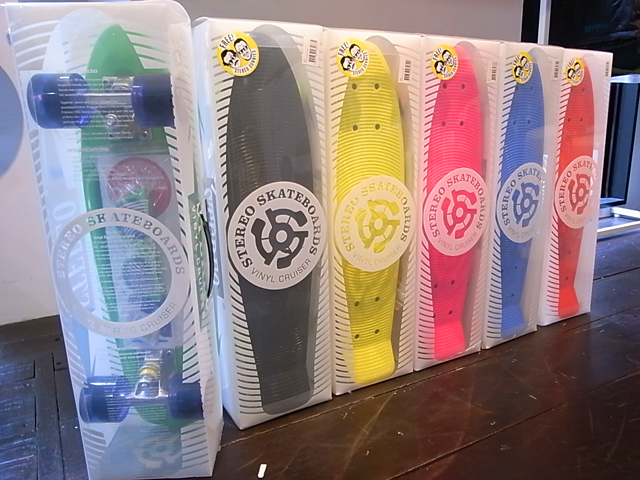 ちょっと寒くて曇っているとどんよりムードになりがちですね。でもね、スケート日和は天気じゃなくてテンションです。素敵な仲間とタイミングがあったミラクルと、デッキを新調したり、すっごく好みのDVDを見た直後とか、「滑りたい」って気持ちがググッと盛り上がった時は間違いなくスケート日和であります。雨が降っていようが寒かろうがそういう気持ちになってるときにはスケートボードは楽しいよ。ま、たまに打ちのめされるときあるけどね。そうなってくるとやっぱり大事なのは外的要因ではなくてすべて自分次第ってことですね。いつだか「すべての悩みの答えは自分の中にある」って文章をみて妙に納得したことを思い出しました。スケートボードは特になにも人のせいには出来ないの。楽しいのも悔しいのも痛いのも気持ちいいのもぜんぶ自分のせい。逆に言うとある程度のレベルからは自分との闘い、いや戦うっていうか自分開き、いや、自分越えの連続になってきます。そしてそうしている人たちは言葉ではなくスケートボードを通じてお互いに理解しあえる。僕はそういうところが好き。なんて言っておきながら朝カーテン開けて天気が気持ちいいとすぐにプッシュしたくなる自分もいます。完全に外的要因。ま、スケート好きは常時スケートボードしたいから、逆にスケートを我慢する理由を探す毎日ですね。なんだかなにが言いたいのか良くわからなくなってきたのでこのへんで。で、ショップにはこちらのSTEREOのVINYL CRUISERが全色どどっと入荷してきております。これいいぞ。ずっと昔のスケートボードの復刻みたいな製品なんですが、デッキやパーツのセッティングが妙にいけてる感じします。これはコンプリートデッキにサングラスとデッキをカスタムするステッカーセットが付属して12.600円。STEREOが設立されたのは90年代なのでオリジナルでこのようなデッキはリリースされたことはありませんが、当時を知る者としてはこのデッキでDUNEとかLEEがクイクイしてるかと思うとかなりニンマリしてしまうのであります。吉祥寺ストアにも浦安ストアにも今なら全色びっちり揃っておりますのでお早めにどうぞ。