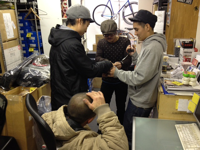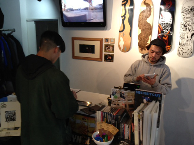そしてFTCのまこっちゃんも24で登場。夜に中野でカラコミのプレミアあるからちょっと早めにチャリっと登場。バッグの中から取り出して見せてくれたのは「湯めぐりスタンプラリー」ですよ。ショップ近所の銭湯やサウナをチェックしてさっそく旅立とうと言うところ、なんとチャリの鍵の番号を忘れてしまって旅立てず。取り急ぎサトルのチャリで湯めぐりは出発して帰ってきてからタクちゃんの工具を借りてカットしておりました。さすがだ。そういう動きを自然にこなしてる。スケートもぜひ一緒に行ってみたい。