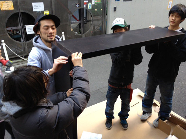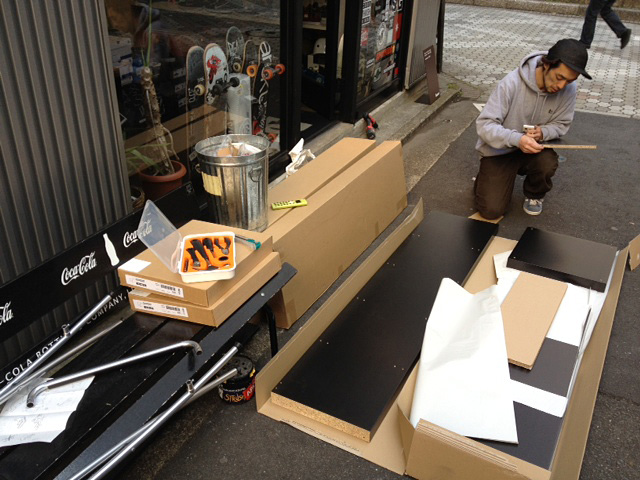 小さいのはサトルが1人でチョチョっと作ってましたが、大きいのはかなり難儀しました。そのうちローカル8年生がやってきて自然な流れでお手伝い。マジ助かった。サトル監督と一緒に作ってましたが、ショップですので電話はかかってくる、お客さまはご来店、友達もやってくるし、気が付くと8年生だけで作ってる。なんと頼もしいやつらなんだ。ほどなくして棚も完成いたしました。ちょっと内側ハゲちゃったのはご愛嬌。