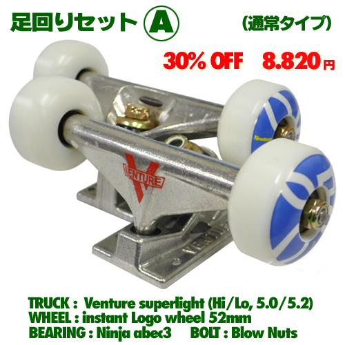 ちょっと現在開催中の「スタートアップキャンペーン」の内容をご紹介してみます。ま、画像を見れば一発ですね。Aセットはこちらの内容。VENTUREトラックに新作のinstantウィール52mm、NINJAベアリングabec3に取り付けボルトにはBLOWNUTSをご用意して税込み8.820円であります。ボルトもあるし、instantでご購入のデッキにはすべて無料でデッキテープが付きますので、デッキ代金+8.820円でピカピカのコンプリートセットが完成です。現在大量放出中のセールデッキと合わせても、ビビッと来た最新モデルに合わせても、お得な価格でコンプリートセットが組めますよ。しかもデッキのサイズに合わせてトラックサイズもできるだけ合わせます。太目のデッキには5.2を。また通常ご指定がなければ5.0HIにてご用意いたしますが、ご希望があればLOにもできます。その場合はご注文時にご指定くださいね。そしてこの春待望のクルーズ足回りセットは次に。