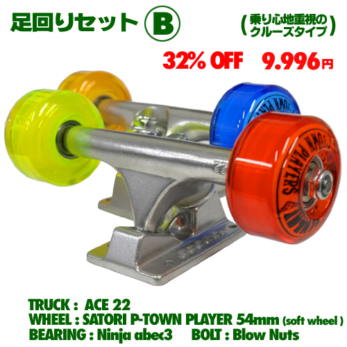 はい、こちらがクルーズ足回りセットです。クルーズ足回りセットは柔らかいウィールを使って高速無音走行を実現する大人にもやさしいセットになります。通常、ウィールは柔らかいほどグリップ力が増し、音が静かになります。たとえば今回のセットに使用しているSATORI P-TOWNは78Aの硬度で非常に柔らかいウィールになります。例を挙げると深夜自宅の目の前からプッシュで出発できる静かさです。このウィールに動きに定評のあるACEトラックと、NINJAベアリングabec3、BLOWNUTSボルトもお付けしてこの価格。10.000円を切りました!ってなんだかテレフォンショッピングみたいになってきたぞ。でもね、僕らの思いはこういう最初に「乗る楽しさ」を体感できるセットでスケートボードに触れてみて欲しいってことなんです。最近はトリックよりも「その辺をプラッとスケートボードで」ってお客さまも増えていて、でもスペックやサイズバランスには詳しくないので、自分で選ぶのはチト不安、って方に向けたセッティングでありますよ。それだけじゃなくて、詳しい人はセットで買ってパーツをバラバラに使ってもずいぶんお得になると思います。こういうキャンペーンは期間限定になりますので、グッと来た方は迷わずご連絡下さいね。スケートライフの扉を開けてみて下さい。