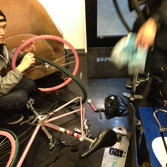 店頭ではたまに飛び込みでパンク修理があります。って言ってもチューブを購入してもらって工具とポンプを使って自分で直すんだけどね。今回はパンク修理はじめてのケースだったので、タイヤの外し方からはめ方から口だけ出させてもらいました。結構パンク修理ってチューブ換えるってだけじゃなくて、レバーでチューブに穴あけないように注意したり、タイヤの内側やリムテープチェックしたり、しっかりもんだり、注意するポイント色々あるのよね。こういうのは基本D.I.Y.っす。