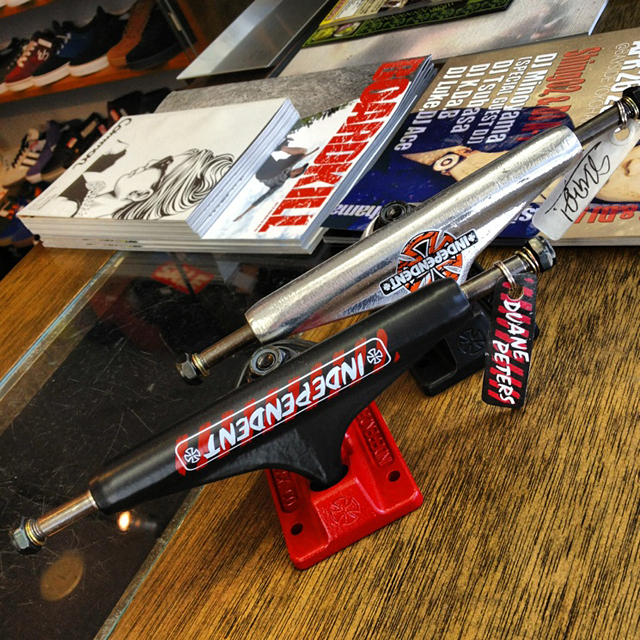 そしてこちらは男のINDEPENDENT。大先輩モデル2種類。デュレン先輩のもサルバ先輩のも149も159もあるのよ。9インチ乗ってる人にはこのサイズがないとダメなのね。159。INDYって老舗でありながらいつも攻めてる感じして好き。109も復活してほしい。こういうトラックを昔のデッキに装着してスケート復活するおじさん増えないかなあ。今は胸張って滑れる場所が増えたしさパーツもいっぱいあるし、選択肢が広くなってるので復活組おじさんたちは楽しいと思いますよ。当時のセッティング組めるしさ。スケートボードはいろんな楽しみ方あるからね。今はシーンが1周以上しちゃってますから、昔のスタイルを楽しむのもよし、最新セッティングで最先端もよし、それぞれにそれぞれのスケートボウ道。ま、どんな形だとしてもベースとなるのは「自分越え」っす。