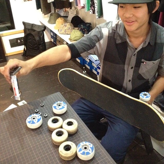 たいしがウィール交換してました。気が付いたらアクセルナットも換えている。さすがだ。アクセルナットって地味だけどこじれると大変なパーツなのよ。よくある地獄が削れちゃうやつね。ナットが何とか外せればネジ切りって工具でねじ山作って復活しますが、こじれて大変なのはナットがはまったままねじ山が削れてナットが外せなくなるやつね。この現象が起こるとまずナットとトラックはご臨終。ワイヤカッターとかでナットが外せればベアリングとウィールは救出できますが、たまに最終形態までこじれるとナット、トラック、ベアリング、ウィールの全てがご臨終するケースもあります。なので、こじれそうになるまえに、ナットを交換するのが正解。一個52円。またはこじれる前にショップにもって来ることね。転ばぬ先の杖。