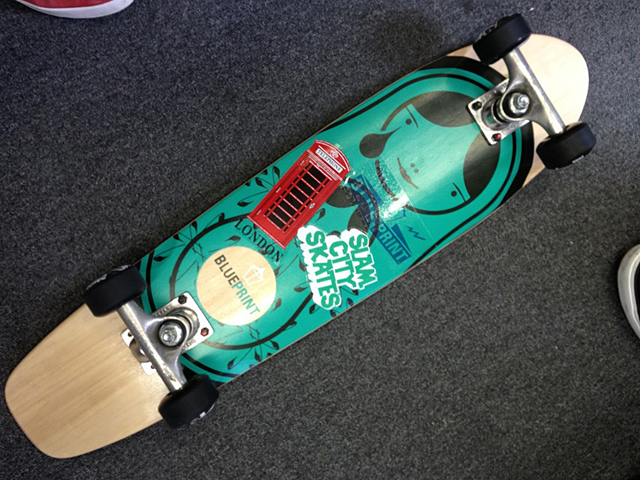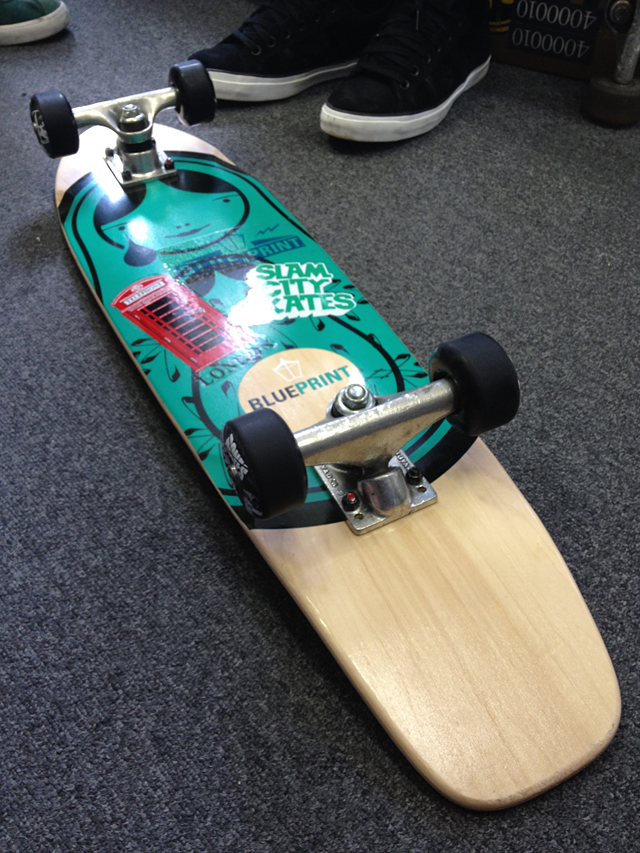 そして浦安ストアにはナギがやってきましたよ。新しいデザイナーの彼と二人で。気になっていたBLUEPRINTのデッキに乗っていたのでさっそく拝見しておきました。これ気になってたのよね。ノーズのないクルーズデッキ。ノーズはあるか。ノーズのコンケーブがないデッキってことね。70'sスタイルでこんな感じにしていると思いますが、通常ノーズのロッカーがないのはロングボードに多くて、7.5インチで短めのデッキだとどんな感じになるんだろうって思ってました。デッキのサイズは7.5×29.375インチなんですが、持ち運びにはジャストサイズですね。素敵なサイズ。乗ってみるとややホイールベースは広めに取られていてデッキサイズを考えるとあとハーフインチくらいホイールベースを短くノーズを長くしたら面白そうな気がします。ノーズのロッカーがないっていう状況が今のスケートボーダーにはすっごく不自然で慣れてない状況だとは思いますが、乗ってみると意外と新しい発見があるかと思います。ナギは普通にテール蹴れそうだね。個人的にはこういうデッキはデッキテープを貼らないで、裸足でのっちゃう感じに組みたいです。そういうセッティングのために、なんかデッキの表面に吹きつけとかでグリップしてくれるゴムっぽい素材ないですかね?シューズでも裸足でも踏めちゃう感じの。おすすめありましたら教えて下さい。