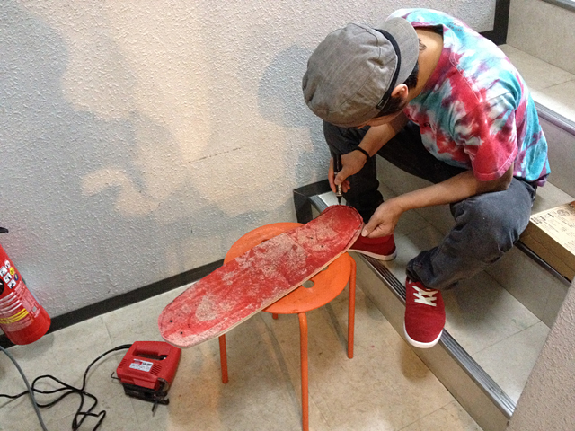 たまにはいいね。雨だからやるか、ってこといっぱいあるからね。また梅雨がやってきますね。今年はどうなるんでしょうか?スケートボード的には雨は嫌だけど、水不足とか困るしね。雨の日はスケビ見てさらにググッとすべりたくなっちゃったりして。あとベアリング掃除とかしちゃってさらに滑りたくなって「ちょっとプッシュだけでもしたいな」なんてね。そういう気持ちは無理して作れる気持ちじゃないから大事にしたいね。先日、塩浜に滑りに行った慶太が雨にやられてショップに来ました。そしておもむろにジグゾーでガシガシとデッキを切って、また新たな慶太クルーズを作ってました。エッジのヤスリがけは慶太考案のプッシュ方式。これはデッキをもってプッシュして、デッキのエッジを道路に押し付けてヤスリがけの代わりにするってやつ。結構キレイに出来るのがスゴイっす。