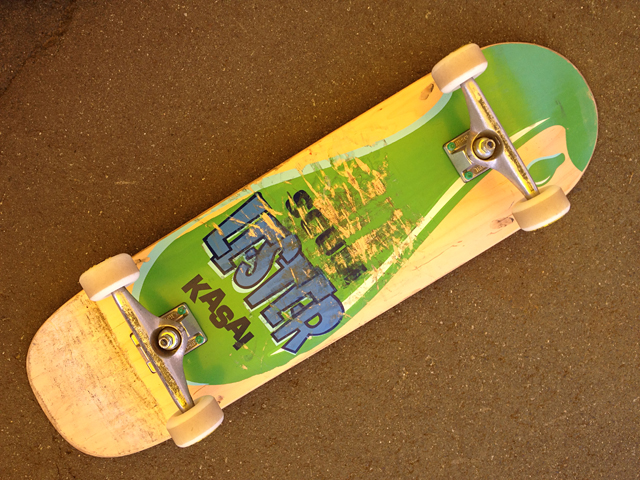 コンテスト会場でバートと楽しんでいた山形JOCKSの佐野くんのコンプリート。レスターカサイのデッキだったので即反応。ところで、レスターのカサイは河西?葛西?笠井?どっかのグラフィックに入ってた気がするんだけど、それすらも記憶が定かでないっす。それわかったからなに、って感じだけどたぶんわかればスッキリしそう。RAD龍に聞いてみよう。デッキのサイズはいくつかな?目測9インチくらい。ホイールベースがやや長くて長さは32.5インチはあると思う。もうちょっとあるかも。このサイズだったらまだデッキテープ普通に貼れるけど、9インチ超えるとグリップテープも10インチ幅のを使う必要があるのでグリップテープの選択肢が減ります。AJSAスタッフのジェッツ森がクリスチャンのデッキを乗ってきてましたが、あれは確実に33インチはあったな。すっげーホイールベースが長いのよ。「クリスチャンはこれでスタンス変えずにオーリーするんだ」って言ってました。それかなりすげー。こういう復刻っぽいデッキもバートにはぴったりかも。サイズが安心たっぷりサイズだし、長めのホイールベースは直進安定性アップしますから。こういうデッキで90'sのスケートライフを楽しんだおじさん達がフルパットでバート始めてみるのいいかもね。楽しいよ。今ならセッティングするパーツも色々揃ってるし、納得の一本が組めると思う。