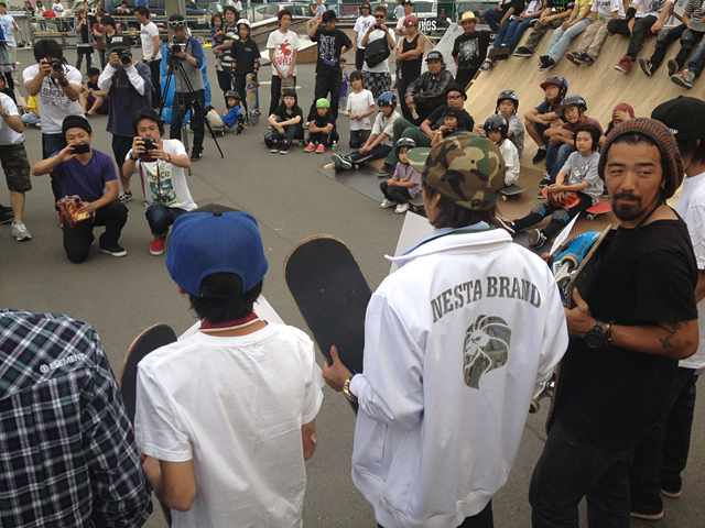 そして先週末はAJSAプロツアー開幕戦に行って来ました。コンテストやイベントはやっぱり天気が気になるところではありますが今回はまったく天気の心配なし。いいね。雨の予報で微妙な30%とかだとスタッフは現地入りして開催できるかジャッジするケースがあります。降ったり止んだりだと雨が止んだタイミングでセクションを拭いたり水溜りをつぶしたりして出来るだけ開催できるようにみんなでがんばるの。ライダーやギャラリーも巻き込んでみんなで会場復旧に全力投球。でもまた降ってきちゃったりしてさ。そういうのも楽しいコンテスト。今回はそういう心配なしにこのAJSAスタッフ&ジャッジ陣が集結してプロツアー開幕戦が始まります。この面子は日本のスケートボードシーンを見続けて支え続けてきた面々であります。ジェッツ。