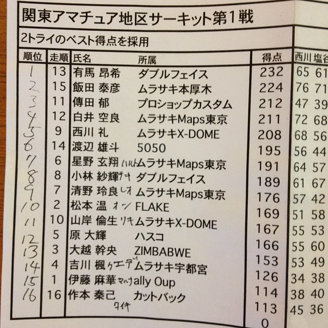 アマクラスはこんな感じね。ジェッツ森がフリ仮名書いてくれたよ。有馬くんはもうダントツかっこいいんだけど、傳田くんの成長っぷりに驚いた。これくらいの年代はコンテストのオフシーズンの間だけですっごくライディングが変わるのね。彼らだけでなく成長が楽しみな選手がいっぱいおりました。
