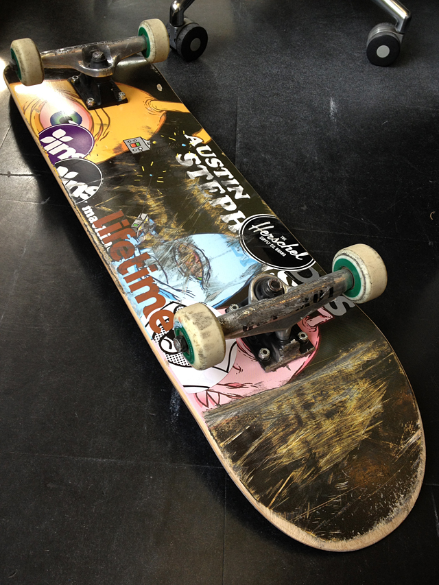 そんなクマがTOYMACHINEの8インチのデッキに乗ってますよ。僕はね、実はクマが7.75インチ以上のデッキに乗ることは永久にないと思ってました。そういうのが僕のダメなところだね。柔軟じゃない。クマは8インチすごく調子いいそうですよ。トラックもデッキサイズに合わせて800ってサイズに変更。クマは7.625→7.75→8.0って変遷ですが、今の方がライディングの奥深さを感じます。それほど遠くないタイミングでVHS MAGにアップされるかと思いますが、やっぱりプリンスクマっぷりはとても魅力的だと思います。デッキを見ると貼ってあるステッカーで現在のサポートされてるブランドとかわかりますね。ステッカーのデザインや雰囲気でコンプリートの雰囲気もちょっと変わるね。素敵。HerschelとかLIFETIMEとかかなり大人なサラリアパレルは似合うひとうらやましいね。とてもクォリティーいいそうで、一度試してみたいっす。