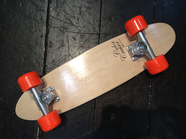 色々やってみました。11にSPITFIREなども今っぽい組合せもよかったのですが、ここはやはりこのデッキの時代背景にテイストを近づけたいと思ってこんな感じに。オーナーさんも間違いない選択眼で最終的にはオーナーさんの判断でビシッとしたセッティングが出ております。このデッキにはデッキテープは貼っていません。ちょっと車に転がしておいて裸足でもツツーッとプッシュでいけるお手軽さ。でも昨今ブームのバイナルクルーザーとはちょっと違ってまったくおもちゃ感はありません。かなりのセメント感。ACE00にオフセットが深めの大きめソフトウィールを合わせてBONESつけたら、もちろんかなりスピードにガンガン乗れる足回りになりました。かなりの「わかってる大人感」が出ているセッティングかと思います。個人的にも同じの欲しい。