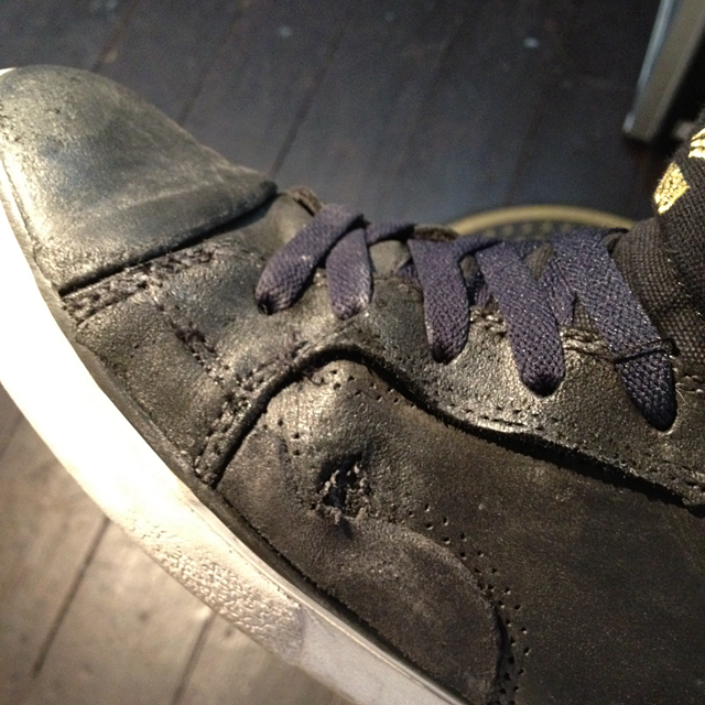 そしてローカルたいしのシューズがまたかなり補強されておりました。今回はEMERICAのHSUなんですが、まずはねシューズ全体にオイルを染み込ませて防水性を高めてます。すごいね。そこ普通は思いつかないよ。そしてたいしお得意のベースのシューズの皮を切り取って新しいシューズに補強を付ける作戦。これがまたシューズのデザインを犠牲にしないテイストでしっかり補強されておりましたが、やっぱりオーリーすれば擦れてしまうのはしょうがなく、もうちょい上に補強を伸ばしたい気持ちであります。でもそうやってスケシューを自分のスタイルに改造するのいいよね。新しい。昔はオーリーパッドだったか皮をシューレースに着けてオーリーで擦れる部分を補強するアイテムがありました。今はそういうの無いよね。自分でやればいい。
