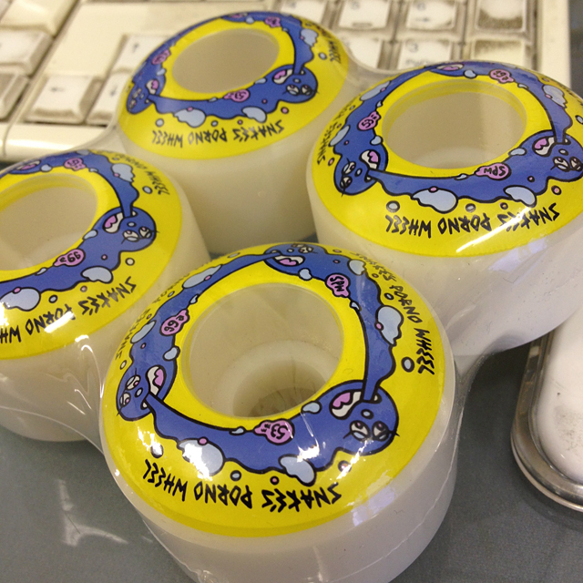 そしてこちらは噂のsnakes porno wheelでありますよ。これは実物見てもらいたいなー。そのスペックが本当に個性的で、プロデュースするヤナさんを知ってる人ならさらに「ニヤ」っとしてしまうことでしょう。またスケートボードの魅力が広がった気がします。