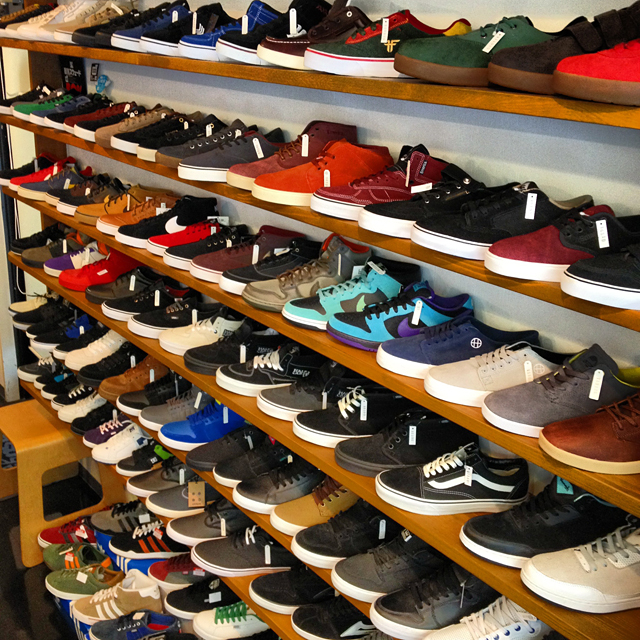 ちょっと浦安ストアで整理がてらシューズラックを見てたら、今はすっげースケシューの種類があるのね。メーカーも多いし、モデルも多いし、カラーもシリーズも仕様も色々あって本当に沢山の種類のスケシューがあります。バルカだカップだスェードだレザーだ、と色々な好みもあるだろうし、やっぱりシューズは気に入ったものじゃないと履きたくない。考えてみたらスケートボーダー達はそうでない人たちの何倍、いや何十倍もシューズを消費するのです。それだけシューズを選ぶ回数も多いし、それぞれの違いも体感するし、スケートボーダーはスケシュー博士でもある訳です。もう25年以上スケートボードに乗ってますが、これまでの経験で「シューズなんてなんでもいい」って人に会ったことがない。というかその反対の「スケシューはこうあるべき」って好みがはっきりしている人がほとんどです。知らない人にはなんでもいいと見えるでしょうが実はスケシューはすっごく奥が深いのであります。