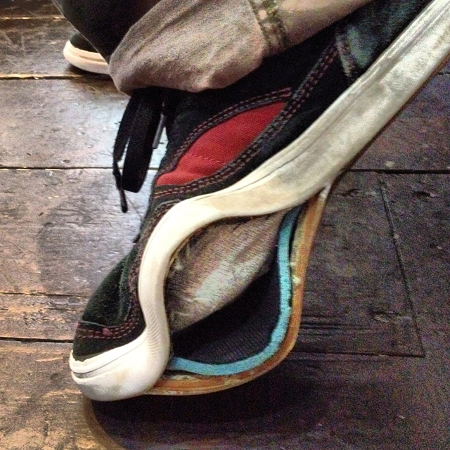 吉祥寺ストアには学生が多いのですが、やっぱりシューズはこんなになっても普通に履いてます。前にはソールが半分無くなったシューズをご紹介しましたが、これもかなりキテルよね。雨の日履けない。そうやってシューズやデッキを消耗しながらスキルを見につけ楽しさを享受する訳です。スケートボード好きな人にはすごく自然な流れです。畑で育った作物や海で取れた魚を食べて生きていくのに似てる。似てない?