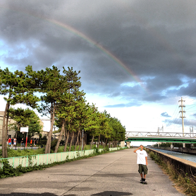 翔太も来ました。かなり楽しんでました。向こうからプッシュしてくる翔太を見てたら背後にでっかい虹が。キレイだったなあ。そしてその後ろの不穏な雲は「まさか雨雲じゃないよね」くらいに思っていたら、機材の撤収の最後の最後にかなり強烈なゲリラ豪雨。すごいの来たよ。シューズの中までガボガボになったからね。そんなこんなでゲリラ豪雨アウトだったのでみんなにキチンとさよならできなかったのよ。大事な夏のお休みに集ってくれたみんな、設営、撤収まで手伝ってくれたみんな、本当にありがとう。またなんかして遊びましょう。また大人の差し入れを頂きました戸倉さん、永関さん、圭太の母ちゃん、モリコスにコニ丸、ぶーさん&しのぶちゃん。テントや機材出してくれたタカさん、焼き台マスターの茂呂さんにゴミ拾いを本気でやった学生チームもほんとにほんとにありがとう。おっとちんねんは誕生日おめでとう!またどこかでみんなで遊ぼう。SSPシャケも今年はやって欲しいしね。でも今年初めて日焼けして今日はちょっと顔が痛い。