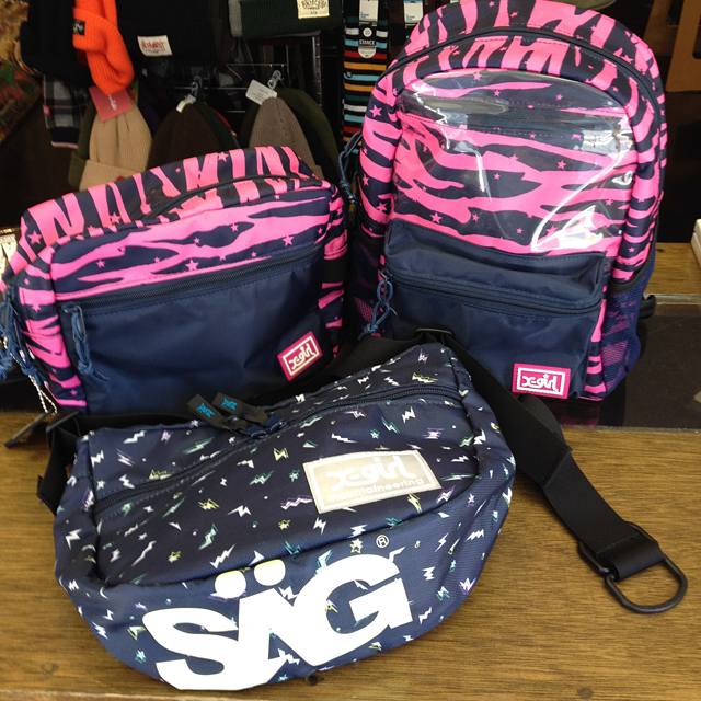 そしてこちらはSAGとx-girlのコラボバッグでありますよ。サイズはどれも小ぶりで女子にぴったり。キャッチーで機能的なバッグであります。WEBストアでもご紹介を急ぎますが気になる方はお電話でも。