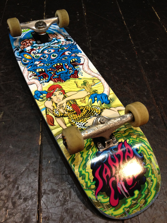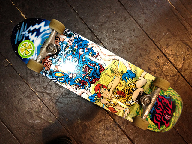 プラッと寄ってくれたSPCのユウキくんのデッキが激アツでした。これは仕事に使うクルーズ仕様ではありますが、本人はガンガンテール蹴ってるみたいっす。デッキはこちらのSANTACRUZの9インチかな。僕が個人的にグッとくるのはこのグラフィックです。あの有名な手に書いた口が叫んでるSCREAMING HANDを書いたJIM PHILLIPSのオリジナル原画ですから。JIMさんのグラフィックはとても好きなの多いのですが、このデッキのようにすごく手が入れられている感じのグラフィックは見入ってしまいます。グラフィックかっこ良過ぎてレールバー付けたいくらい。