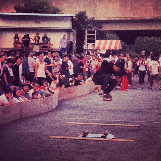 みんなで向かった先は858ナイトであります。吉田徹も居るって聞いてHIBRIDのプレミアもあるって聞いてもう行くしかないかと。行ってみたらまた楽しい空間が。シンペイくんのBUENAランプもスタンバッてるし、バニーホップコンテストからのオーリー幅跳びがあったりして、ジェシーの手ぬぐいもらってあがったり、アキラとヤックンとディックマン達も居て、スキッドキングの井原くんにも久々に会ったし、もう言ってよかったうれしかった。一番アツかったのはこのオーリー幅跳びね。優勝の選手の走り乗りっぷりがハンパなかったっす。誰か動画上げてよ。あれは跳べる跳べない抜きにあの走り乗りだけで僕の中では優勝でした。