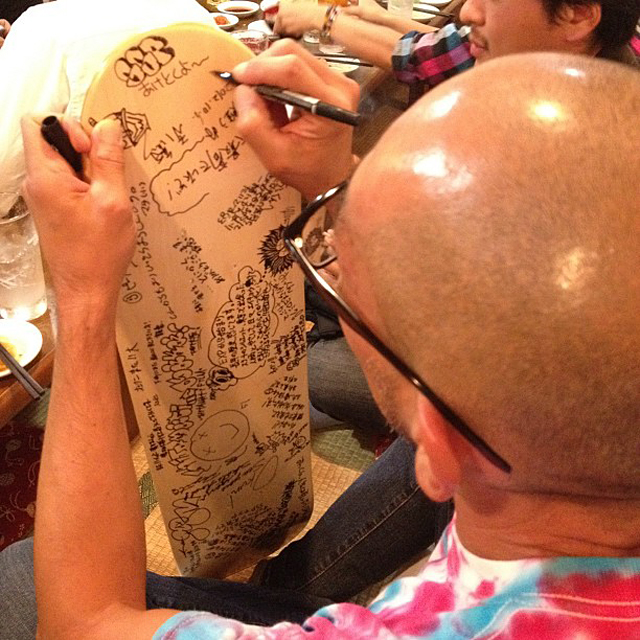 スケートボーダー送別会の恒例と言えばこちらのメッセージボード。今回も面白かったよ。真ん中にスペースが空いて、ワッチョがそこを埋めることになって色々考えてる途中に、フラッとマッサンが来て×ピース君書いちゃって、ワッチョ激落ち。でも最終的にはみんなそれぞれの思いが詰まった最高のメッセージボードが出来上がったと思います。素敵です。SITAMATIの思い出が詰まってます。