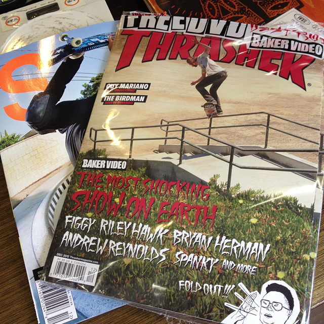 そして、そして、そして、こちらがドドーンと入荷しましたよ。THRASHERの最新号。今回なにがスゲーかといいますと。最新号にはなんとBAKERのフルレングスDVDが付属しております。これね、先日USのプレミアで警官いっぱい出動した超みんな見たいDVDなんですよ。そろそろリリースされるTHRASHER JAPANにも付属する予定ではありますが、早くみたい人は急ぎ目で。こればっかりは早いもん勝ちよ。WEB更新前は電話にて!840円。MAGの最新号も素敵です!