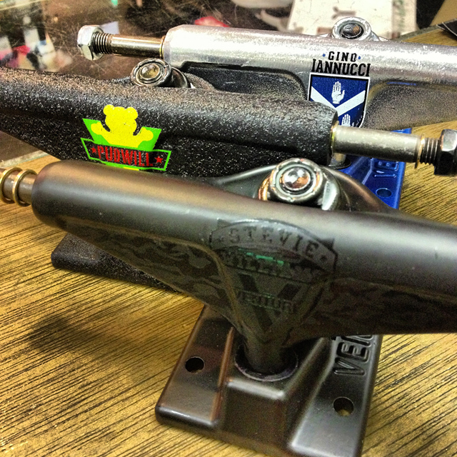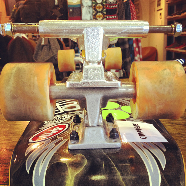 インスタントではこちらのトラックが大人気。INDEPENDENTの109なんですが、しなやかな動きとクイックな反応でクルーズにぴったりなトラックであります。僕がウッチーから受け継いだオリジナル109と比べたところ、少しシルエットが変わってました。こういうのってオリジナルの金型使うんじゃないんだね?新たに金型作ってました。stage9まで109があったらそんなに前の話じゃないのにね。ま、それはいいとして109の良さは完全に復活しておりますので、クルーズ好きには胸を張っておススメできるトラックです。冬のクルーズはポケットに手を突っ込んじゃダメよ。ちょっと早めにグローブ用意しておいてください。ポケットに手を突っ込んだまま下り坂で溝にウィールがはまって前歯をがっつりやられた友人がひとり居ます。