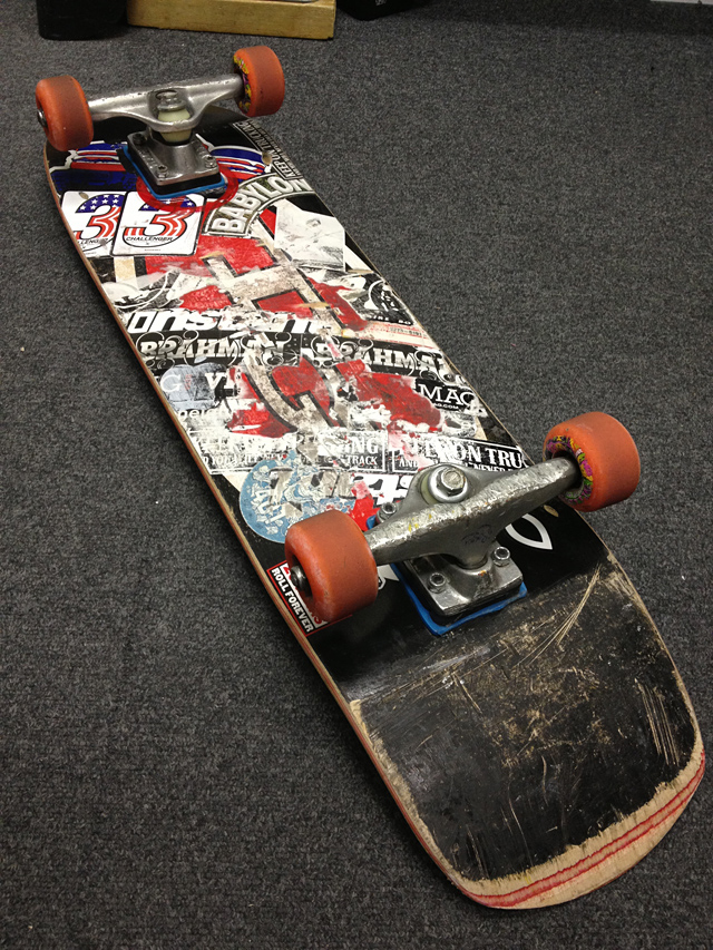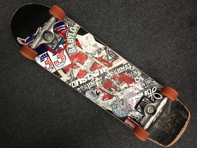 ここから見るとまたいじった形跡が見れていいね。まず、ウィールはクルーズにしてはかなり小さ目なのね。52mmくらい?それにROYAL-OGって車高の低いLowトラック装着して、スペースパットをガンガン入れて高さ調整して鬼プッシュですから。スタイル出てます。世の中的にはやっと大人が普通にプッシュしててもおかしくな環境になりつつあると思ってます。地域差はあっても確実にスケート環境はよくなっていく。大人たちが普通にプッシュしてる街並みに早くならないかなあ。僕らがまだ乗れるうちにね。オヤジスケーツは結構全国的に増えてますよ。実際にショップにいると昔からの友人からオーダーがあったり、40から初めてのスケートボードの人が来たり、いい感じになってきてます。今、ガッツリ滑ってる人は胸張って滑り続けましょうね。次のステージがもうすぐそこに来てる感じします。