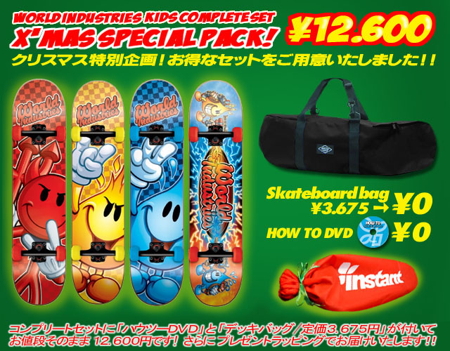 インスタントでは、WEBストア、浦安ストア、吉祥寺ストアにて「キッズコンプリート クリスマスパック」をリリースいたしました。こちらのセットは、この時期だけのお買い得な内容になっております。まずハウツーDVDが無料、instantデッキバッグが無料、そしてなんとkidonaのデッキバッグも無料で!これすごいぞ。かなり頑張った。キッズデッキもサイズやグラフィックがあるのでジックリ選んでみてください。各モデル在庫がなくなり次第終了です。今年のクリスマスはおもちゃ屋さんじゃなくてスケートボードショップでスケートボードをお選びください。お子さんの上達・成長に合わせてご相談にも乗りますよ!