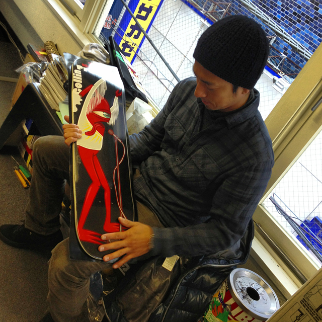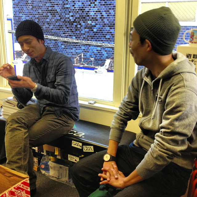 その後、CHROMEのキャプテンも来て今度はBAG談義ですよ。t4sってスケートボード用のバッグを15年位前に浅岡と作ってて、当時のサンプルを引っ張り出してあーでもないこーでもない、と。なんでもなんか作るのって楽しいよね。スケートボードってずっと作り出す作業の連続なのでスケートボーダーはこだわる人、作り出す人が多いよね。キャップ出張楽しんできてね。