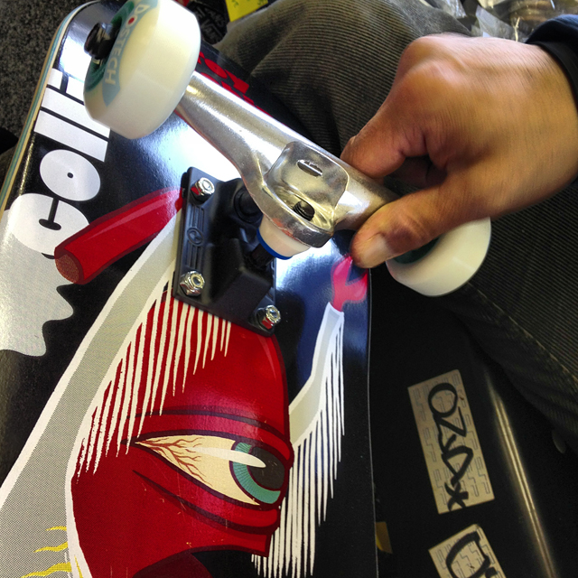 今回はコンプリートセットを全部新調してました。うん。お正月っぽいぞ。クマは新品の時点でブッシュをBONESに交換します。やっぱり好みの動きと反発力が魅力みたいね。プロライダーは常人ではわからないレベルのこだわりがあるのです。instantsのコンテンツ、「元祖 デッキ拝見!」の最初の方に出てくる山ちゃんとか当時はブッシュを煮沸してましたし、indyの129で内側にワッシャー3枚を入れないとダメって人やデッキのホイールベースは絶対に14インチって人もおりました。面白いね。スケートボードとスケートボーダー。