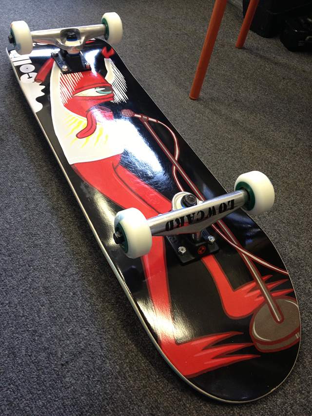 話はそれましたが、クマのセッティングはここ最近すごく安定していて、8インチに合うFURYの800にDostechの52mm、DostechのRベアリングって組み合わせて完成してます。こんなにキレイなクマのデッキが見れるのはかなりレアなんですよ。だってね、クマの燃費の悪さったらさすがのプロライダーなんですから。ちょっと小声になりますが、クマは三回ガッツリ滑るとデッキ一本終了しちゃうのよ。すごくない?ま、一緒に滑りに行くとわかりますが、カーブのスポット行ったら速攻でグラフィック全部消えちゃいますから。帰り道ではもうどんなグラフィックだかわからない。デモやコンテストじゃなくたって見ていて気持ちいいくらいのライディングを普段から。シューズも結構早いのよね。僕なんかデッキは半年、シューズは2年は大丈夫。やっぱりプロライダーってすごい。そういうライディングの積み重ねが皆さんが家で観れるDVDなんですね。クマの過去のパートを全部見てみてよ。すっごいから。