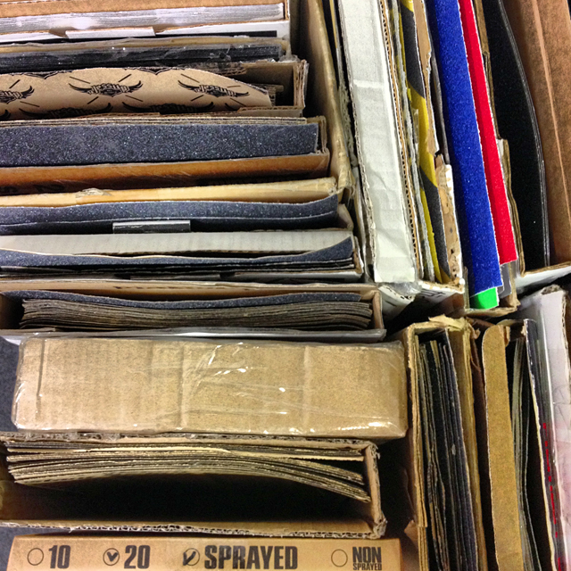 グリップテープも今はいろんなのあるんですよ。浮いちゃったのはサンプルね。お客様に貼るグリップではありませんのでご安心を。でも冬の間は気温が低くてMOBとかJESSとかは粘着力が弱くなって発送の間にちょっと浮いちゃうこともあるようです。主にテールやノーズの曲がり際なのですが、そういうときには愛情もって手のひらでグーッと押し付けて下さい。ちょっと暖まるとかなりガッチリ着きますから。さっきチェックしてみたらグリップテープだけで抜きや色別に考えると20種類以上あるんだね。すごいね。ご来店の方はじっくり選んでもらっていいので、お気に入りのデッキにお好きなグリップを貼ってみてください。いや、貼るのは僕らもやりますのでお気軽にお申し付け下さい。