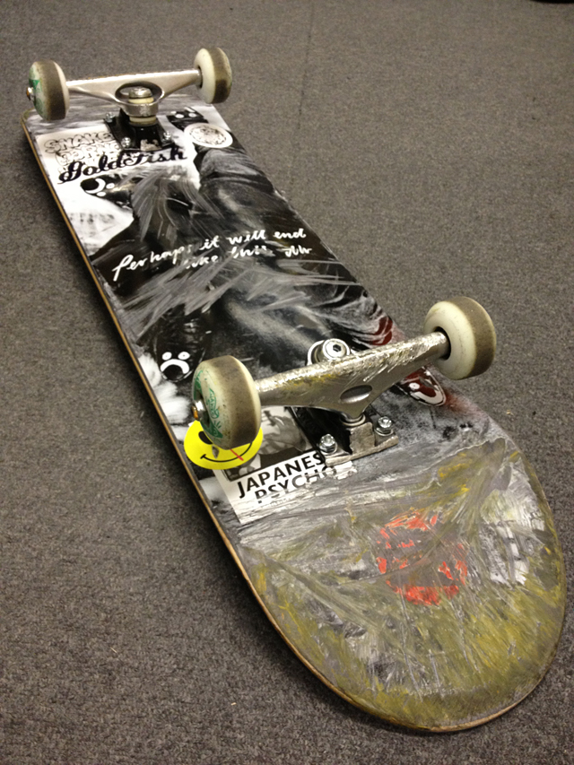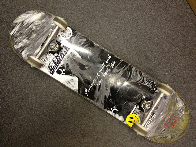そんな影響力のあるヤナさんのセッティングを拝見しました。ヤナさんといえば数々の名作DVDにパーツを持つニッチスケート職人であります。VHSMAGのパートとか素敵ですので観てみてね。少し前までは友人のスケートショップでデッキを買った人に貼ったグリップの余りを集めて自分のデッキに貼ってましたが、今回はかなり機能的にグリップテープを貼ってました。写真にはありませんが、ノーズ部分の先端はグリップを貼らずにもった時に指にダメージが残らない仕様。さすがだ。常にデッキと行動している人はやっぱりそういうところが気になるのよね。さすがだ。ま、デッキテープはよしとして、デッキはPOLARのポンタスさんの8.0インチ。POLARはTWSのBEST RANDってAWARD獲ってましたね。DIYからワールドワイドへの変遷を見守りたいと思います。POLARのデッキはそのグラフィックのシニカルな感じだけで人気がある訳じゃなく、クォリティーもすっごく良い感じです。木がカンカンです。このブランドは人気サイズも8.0インチオーバーの方が需要が高い。ブランドによってそういう点も変わってくるのでショップで見てると楽しいです。