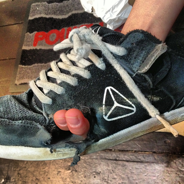 中学3年生はついに受験本番がやってきます。この一年みんなよくがんばった。そんな受験生ダイキのシューズがこれまたお見事でありました。これは何度も流血してるね。絶対。中学生のスケシューはもう本当にすごいのは博物館に入れたいくらいよ。テンマのesなんて前にも紹介しましたが、つま先からかかとの手前までソールが全部無かったですから。それはもうシューズじゃない。血と汗が滲んだアート作品であります。買わないけど。