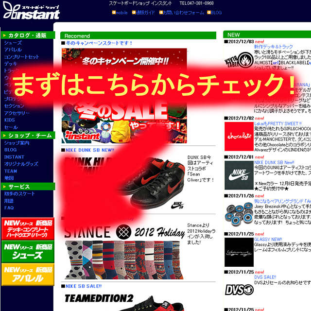 これからは新作デッキやNEWシューズ、アパレルの春夏物など続々と入荷してきます。インスタントのWEBストアのTOPページの画像の矢印の部分は新しい入荷アイテムをカテゴリーごとにまとめてご紹介しているページです。シューズを探している人はまずこちらの新入荷シューズをチェックするもよし、ブランドごとに好きなモデルを探すもよし、デッキもアパレルも色々チェックして頂きたい。新入荷は毎日のようにありますので、たまにインスタントのWEBをチェックしてくれる方はまずこちらのNEWデッキ、NEWシューズ、NEWアパレルのアイコンをクリックしてチェックしてみてください!