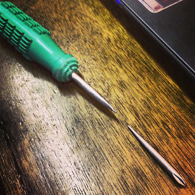 そして先日、また相棒のデッキテープこすり用のドライバー18号がR.I.P.しました。ま、もうかなりの本数折れてるので正確な本数は覚えてないですが。デッキテープを貼る時に、カッターで切りやすいようにデッキテープの淵をドライバーでこすってシェイプがわかるようにするのです。棒ヤスリを使ったり別の工具やトラックのハンガーなんかも使ったことがありますが、僕はやっぱり太目のプラスドライバーが一番調子イイのです。しかも最近では100円ショップに並んでいるのでもう毎回3本買いです。前はホームセンターで黒いのとか買ってましたが結局折れるし耐久性はこの場合はそんなに変わんない感じもするのでしばらくこのペースで折り続ける事になりそうです。