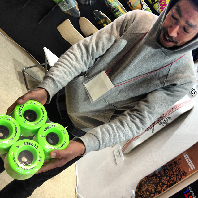 そうそう。インタースタイルも行ってきました。かなりタイムラグのある後パブではありますが、インタースタイル面白かった!今回は朝の9時にコタツとRAD龍と地元の駅で待ち合わせして3人ピクニック。これがまたこの二人は絶対に遅刻しないのよ。僕も今回はかなりテンション高めで15分前に到着しました。そしたらもうコタツ居るし。おはようって言ってたら改札からRADが出てきた。まだ集合時間13分前。さすがだ。さすが過ぎる。そのまま向かった横浜パシフィコですが、どうしても正しく発音できないのよ。パフィシコになちゃう。ま、どうでもいいけど。インタースタイル会場はブースいっぱいでなんだかすごく盛況でありました。ランプも楽しそうだし、スケートのブースもいっぱいだし。僕とRADは最初に入ったBE-IN WORKSのブースでこのウィール見つけちゃった。ウィールっていうか小さめのメロンが4つ。107mmって言ってましたね。これつけたい。でもプッシュで前足のヒザ回りがガタガタになりそう。こんなのでダウンヒルしちゃう人たちは本当にどこかおかしいぞ。