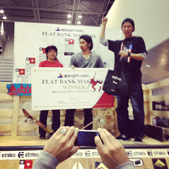SONIKからオファー頂きまして、AXION BANK MASTERSのMCを。これがまた楽しかった!コンテスト前に寄ったブースで選手の情報を仕込んでましたが、ETNIESを扱うPICのブースでナガシメンが「ETNIESチームは3人合わせて110歳!」って言って下さい、と。さすがだ。今回のコンテストはシューズブランド対抗ってことで各シューズメーカーから3人のライダーが出場する形式。3人の組み合わせがまたコンテストとは別の楽しさがありましたが、ETNIESチームは僕的にもかなりツボでありまして、吉田徹、大矢尚孝、北村浩一、の3人がチームで出る訳ですから、日本のスケートシーンを知ってる人にはもうたまらんな面子。3人で110歳っていうのも全然ハンデにはなってないす。決勝は岸海、山城正隆、廣木一浩のDCチーム。ここは三人合わせて60チョイ?ま、それはいいとして結果的にはDCチームが優勝です。正隆アツいね。ファンになっちゃう。ま、それもいいとして海くんがかなりキッズから少年になっていてかなり頼もしくなってました。