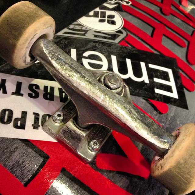 そして銀座DIESELのSHAKE JUNZIも来てくれた。もう宮下で滑ってる人はみんな知ってるJUNZIくんであります。今回もまたモノクロセッティングでかなりド渋なコンプリートを組んでましたが、ちょっと見せてもらったこのトラックの削れ方がお見事です。普通はレギュラーの人はどうしても50-50が多くなるから特に後ろのトラックはかかと寄りのハンガーが削れていることが多いの。そこだけシャフト見えてるみたいな感じで。でもJUNZIくんのはすっごく均等に満遍なくハンガーが削れてる。アーリーウープグラインドが得意でかなりいいの出してきます。一緒に滑れるといいなあ。55ランプもなくなってしまうとのことで、JUNZIくんやKUROちゃんと遊びたいっす。