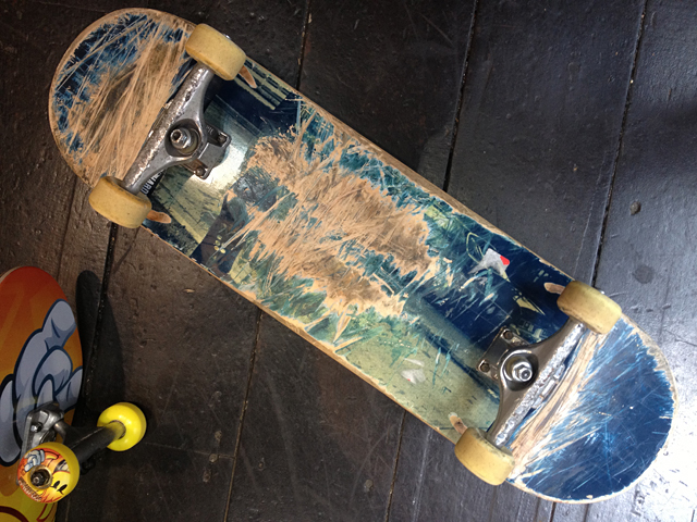 そんなTIGERのデッキがこちら。NYの現役でありますからかなり東海岸のポピュラーな感じになのかと思います。デッキはHARDTIMESの8.5インチでした。でけー、って思って聞いてみたら、地元ではそんな驚く感じの太さじゃないらしいです。instantsケントも8.25インチに乗ってますが、TIGER曰く「確かにちょっと太めかも知れないけど、ポピュラーなサイズは8.125から8.25インチくらいかな。8.5インチくらいなら乗っている人いっぱいいるよ」と。TIGERの体格的には185cmくらいの身長で足の大きさは11インチって言ってました。やっぱりそれくらいの体格だったらこのサイズ全然おかしくないっすね。身長170cmで足の大きさ27cmくらいの人が7.875インチ乗るのと同じくらいなんじゃないのかな。あとは個人の好みやスケートスタイルもあるので最終的にはデッキサイズは好みです。乗ってみて決まっていく。だから最初の一本もそんなに細かくサイズにこだわらなくていいかもね。特にサイズ決まってなければおすすめできる理由があるサイズがあります。ま、その辺はいつでも相談に乗りますのでお問い合わせ下さいね。
