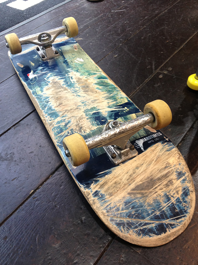 トラックはこれたぶんINDY149。サイズは?って聞いたらたぶん149か159って言ってました。そんなにサイズ考えて付けてないんだね。たぶんデッキに乗せて「これくらいか」って感じで選んでると思う。それ正解。デッキのサイズとかメーカー発表サイズと実寸が違っていることもあるのでかなり細かく合わせたい人はそうやって見るとすぐわかる。そういうこともあってインスタントではメーカー発表のサイズと表示サイズが違っていることもあります。日本規格にサイズ変更している場合や、シリーズでいくつか出ているサイズのひとつしか入荷しない場合などもあって、微妙なときには測ってから表示サイズを更新してます。おっと脱線。TIGERのウィールはBONESでした。SPFの56mm。コニカルシェイプ。「ウィール大きいね」って言ったら「そうでもない」って。TIGERはTOUTUBEとかでチェックしたらR好きトランジッション好きな匂いがしましたのでそれなら大きいって訳じゃないよね。BONESブッシュのMEDを入れてかなり柔らかめなセッティングでした。ベアリングはBONES SWISS。なんだかかなり納得のうなずけるセッティングでありました。そうそう。今週日曜日に帰国するらしくてそれまで毎日どこかで滑ってます。昨日は八王子行ってたみたいね。どこかであったら話しかけてみてください。see you againって日本語でなんて言うんだ?って聞くから別れ際には「matane-」って言うように教えました。