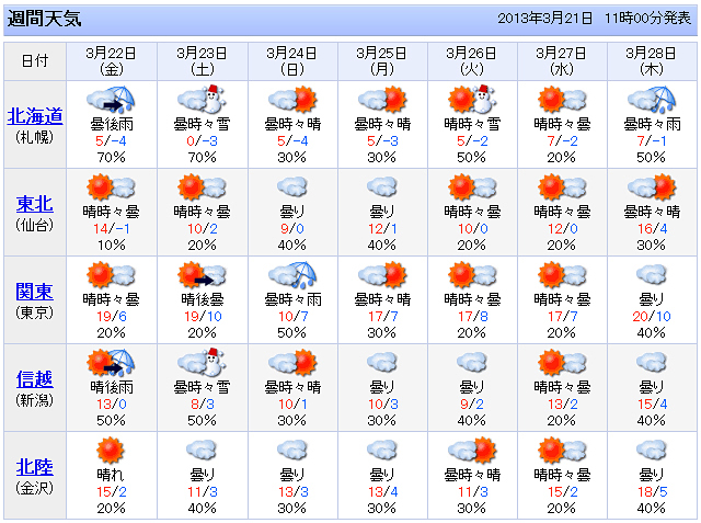 やっと天気予報見ました。って見たら日曜日だけ雨マークあるじゃん!こらこらって一人突っ込みしましたが、ここは雨だと残念なんだよなー。今のところ50%。ここから皆さんの元気玉で確率どんどん下げて行きたいと思います。前日夕方の天気予報で雨の確率が60%を越えている場合はスクールは31日に延期になります。また微妙な50%の時とかは当日の朝7時くらいには開催の可否をこのBLOGにアップしますのでご確認下さいね。みんなで楽しく滑りたい!