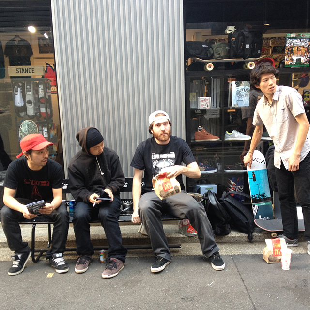 先日、NYのseasons skateshopのライダーのTIGERが遊びに来ました。なにやら7年ぶりに会うケントの家に泊まっているらしくケントと一緒にプラリと遊びに来て渋谷のパークに滑りに行きました。ショップではLOWCARDのツアー特集の記事に出てるのを見せてくれたり、youtubeでショップの動画を色々見せてもらいました。背が大きくて髭モジャでかなりド渋でありますがTIGERはなんと25歳。僕は敬語で話してました。ま、それはいいとしてPCあるとかなり便利だね。動画が見れるとなんかそれでかなり自己紹介的な部分をすっ飛ばせる。スケートボーダーって楽。昼早くには渋谷に向けて出発しておりました。